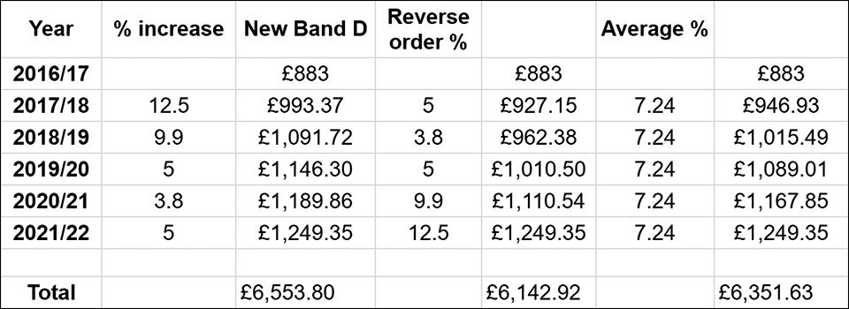 However there is a huge difference in the aggregate amount of tax collected over the five year period with highest-increase-first raising £410 more per Band D property than the reverse order and £202 more than that from a consistent average increase.
