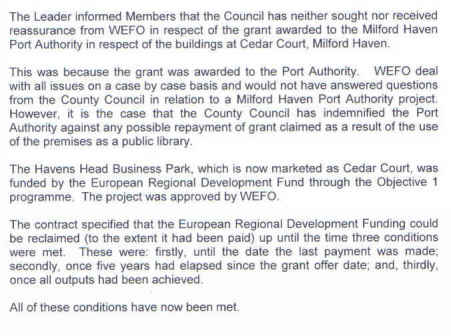 So I put down a question at the last meeting of full council asking the Leader what assurances the council had sought from WEFO regarding any possible clawback.