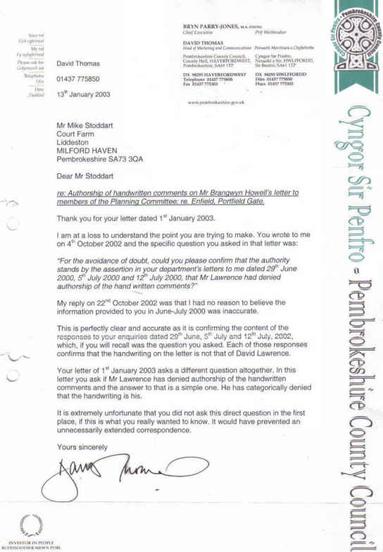 So, in June 2000, I wrote to the council's press office enclosing a copy of the annotated letter, asking if they could confirm that they were written by Mr David Lawrence whose name appears at the top of the letter.