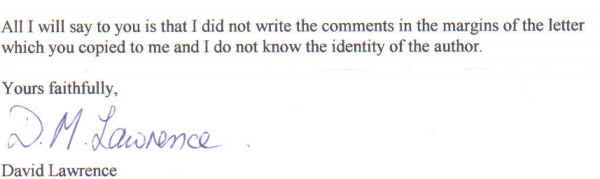 The reply was characteristically brief:"The comments were not written by David Lawrence and in the absence of any initials, it is not possible to say who they belong to."