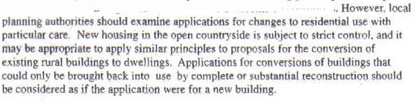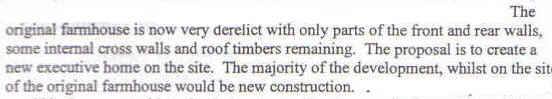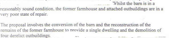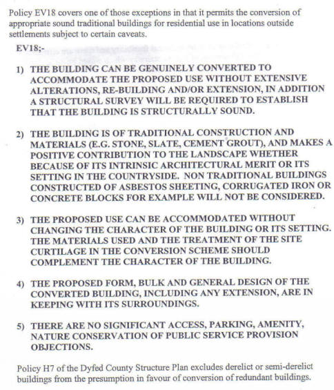 In his report to committee in March 2002, Head of Development Control, David Lawrence, said that the former farmhouse, which constituted the main part of the proposal, was very derelict and needed almost complete rebuilding, and, in his verbal presentation, that it was crystal clear that this was against policy EV18(1) which requires that: The building can be genuinely converted to accommodate the proposed use without extensive alterations, re-building and/or extension".
