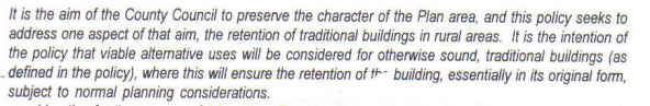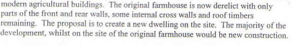 In 1995 permission was given for the conversion of a small, intact barn on the site under policy EV18 which allows the renovation of sound traditional buildings provided it does not involve "extensive alteration, rebuilding and/or extension" (see below)