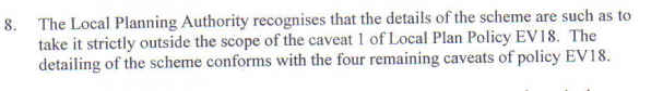 Planning committee approved the application and when it arrived at P and R, Mr. Barrett-Evans echoed this proposition when he told members that, though the application did not comply with Policy EV18 (1), it did accord with the other four sections of Policy EV18.