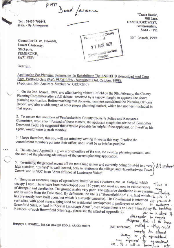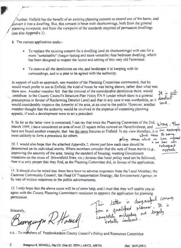 The letter printed below was sent by the applicant's agent to all members of the policy and resources committee, one of whom forwarded a copy to the planning department where someone wrote a series of notes in the margins.