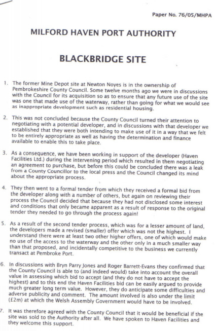 This document casts light on the strange goings-on in late 2005 and early 2006 during the sale of the former Mine Depot at Blackbridge.