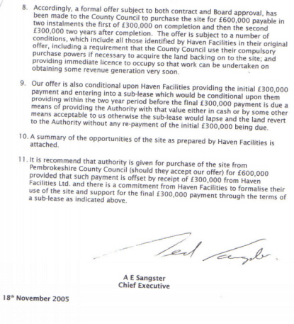 The highest bid was that of a consortium of Milford businessmen Cleddau Enterprises Ltd (CEL) (£550,000) while the council's preferred bidder Haven Facilities Ltd (HFL) was in third place with £310,000.
