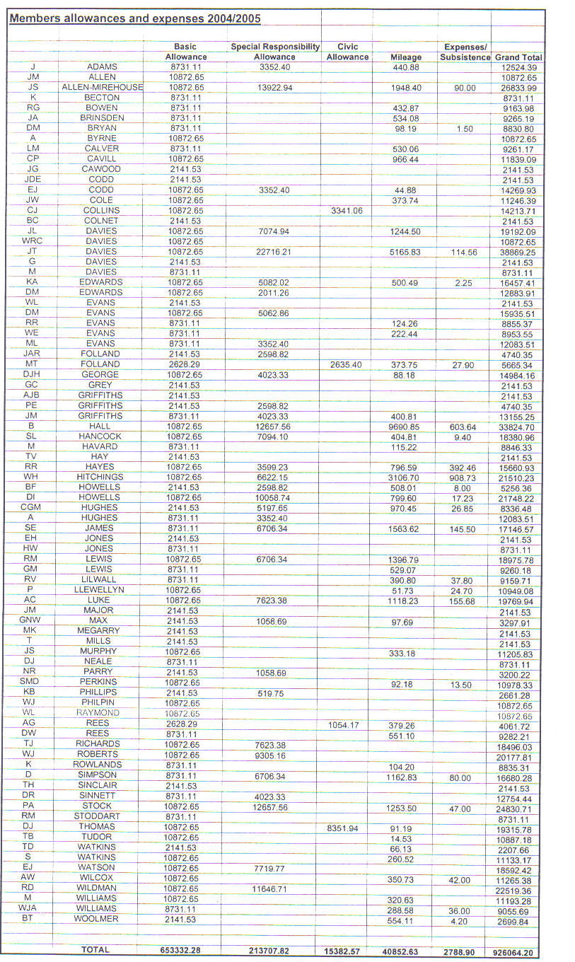 Note: These figures are distorted by the fact that 2004/2005 was an election year. The member's basic allowance is £10,872. Those who drew £2141 either lost/didn't contest their seats at last June's elections; those on £8731 are newly elected. The same considerations apply to special responsibility allowances.